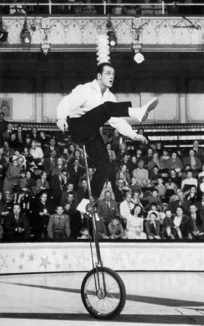 He could build a stack of tea cups and saucers on his head by kicking them up from his foot. Another trademark trick was force bouncing seven balls off a drum. In 1949, Horn began a three year stay with Circus Krone. He managed to find a unicycle owned by the high-wire act, and within a week he could ride it. By combining his unicycle with the tea cups, he became very well known, very quickly.