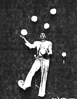 My father's three torch routine was outstanding. Sometimes he would start by juggling five torches. He did this near the end of his life and said he used to do it in Europe. But usually he just did the 3 torches along for the finale. Much like the opening three sticks routine, it was very fast. It ended with my father tossing the torches up from behind his back with high triple spins. This ended with a toss behind the back of one torch way up to high to the very top of the tent. I was always amazed at how he managed to get the thing to go so high up. The crowd would usually register a big "ooooh" as the thing went up to the ceiling. He would end the torch routine finally with the rapid waving effect I mentioned he did with the three sticks as my mother would pull him from the back (guiding him) as he walked backwards off stage, seeming to be more-or-less dragged off by my mother. (In some venues, fire laws made it impossible to do the torches, so my father had some clubs made up with flashlight bulbs at each end with batteries attached, so he could simulate the effect in the darkness -- though without such dramatic results).