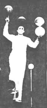 He always opened with a three sticks routine. Emphasis was on speed and the look of speed. It included the usual under the legs and behind the back continuous tosses, a shower which looked effective because it was done "sideways" (that is, with the spinning done on the plane parallel to his face), cascading the sticks upright without spinning, spinning the sticks on the top of his head as they went from one hand to the other, and a fast finish in which he actually held on to the sticks and swung them over his shoulders and back (really a kind of waving of the sticks which made them look like they were going twice as fast as they really were being tossed). All this was done with some little posed moves from time to time as he might break it up with things like placing the stick on the forehead for a short balance, etc.