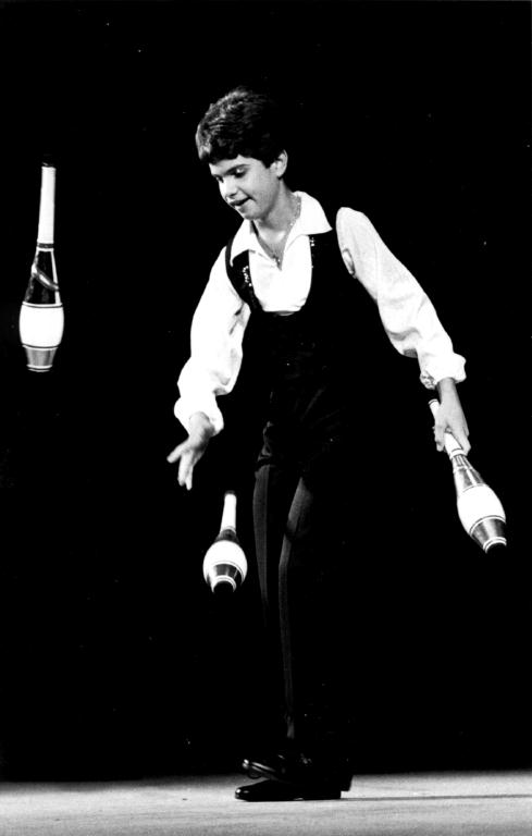 The 13-year-old Las Vegas resident and professional juggler opened with balls, doing five with back crosses and overhead throws. He did a seven ball cascade with perfect sequential toss back into a net held by his father, Nick. Working with rings, Anthony did a pirouette and more than a dozen pancake throws with five. With a coyote prop balanced on his head, he juggled eight rings and flipped them up to be caught on the coyote's nose and hand.