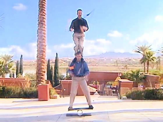 Owen's shoulders, as they each juggle 3 torches, and tell their version