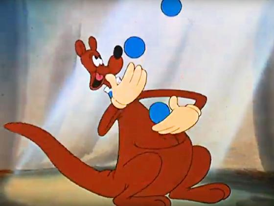 At 01:33, a kangaroo juggles 8 balls, and finishes by catching them all in its pouch.