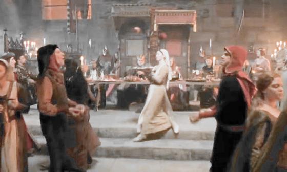 At 30:45, during a banquet scene, 2 jugglers are passing balls in front of