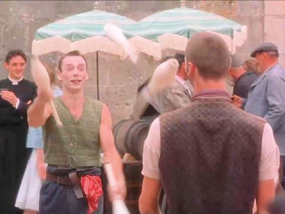 At 1:52:25, during a town celebration in a courtyard near the end of