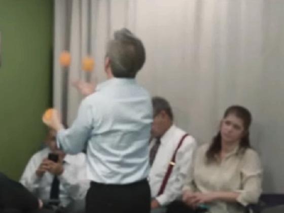 juggling 3 orange balls.