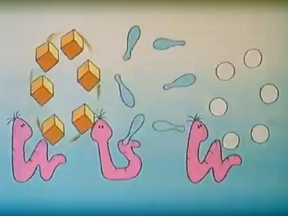 a worm juggles 4 balls with his tail, and then 3 worms juggle 6 objects