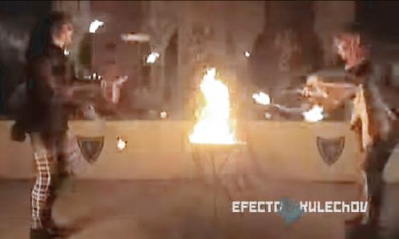 one manipulating a fire devil stick and the other juggling 3 torches.
