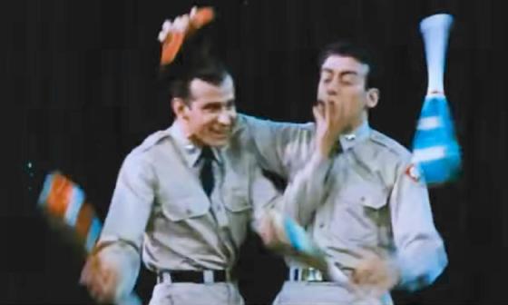 juggle 3 clubs together while doing quick steals of a hat and a cigar.