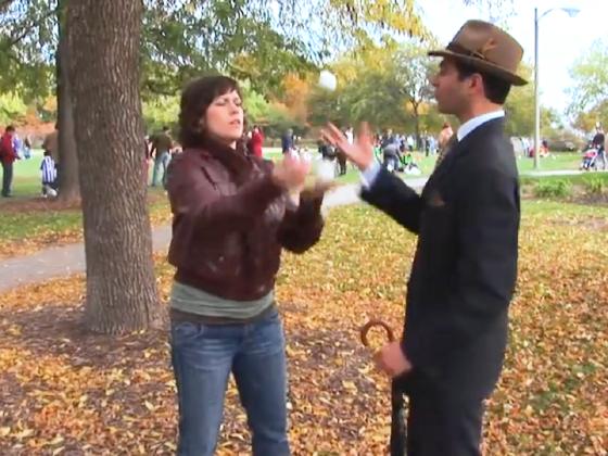 juggle, and continues to juggle them himself with several simple tricks,