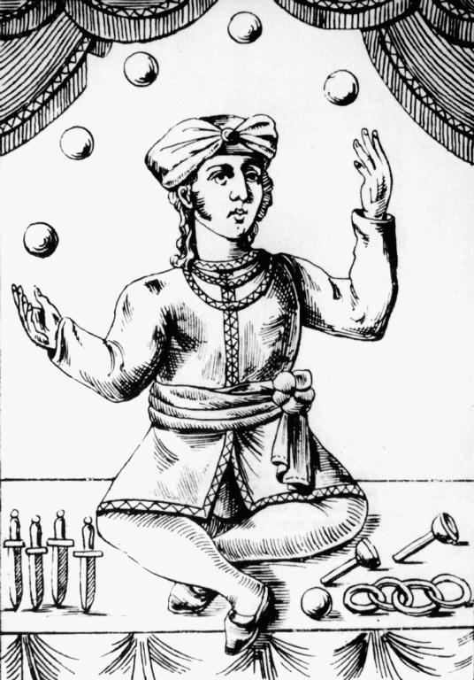 Historically, the words used to describe juggling lump it together with other activities that vary by time and place. The Medieval Joculatores and later Jongleurs and Jesters were primarily singers or other kinds of entertainers. Similarly, among the Celts a juggler could be a clesamnach (a performer of tricks or feats) or a drLth (fool). Later, the French Bateleur would do juggling, tumbling, and magic tricks. Bateleur is also the name for the Tarot card that is known as the Magician in English. The words prestidigitation and legerdemain also group juggling with magic (see, e.g., [7]. As a result of circuses, juggling is now most commonly associated with clowning.